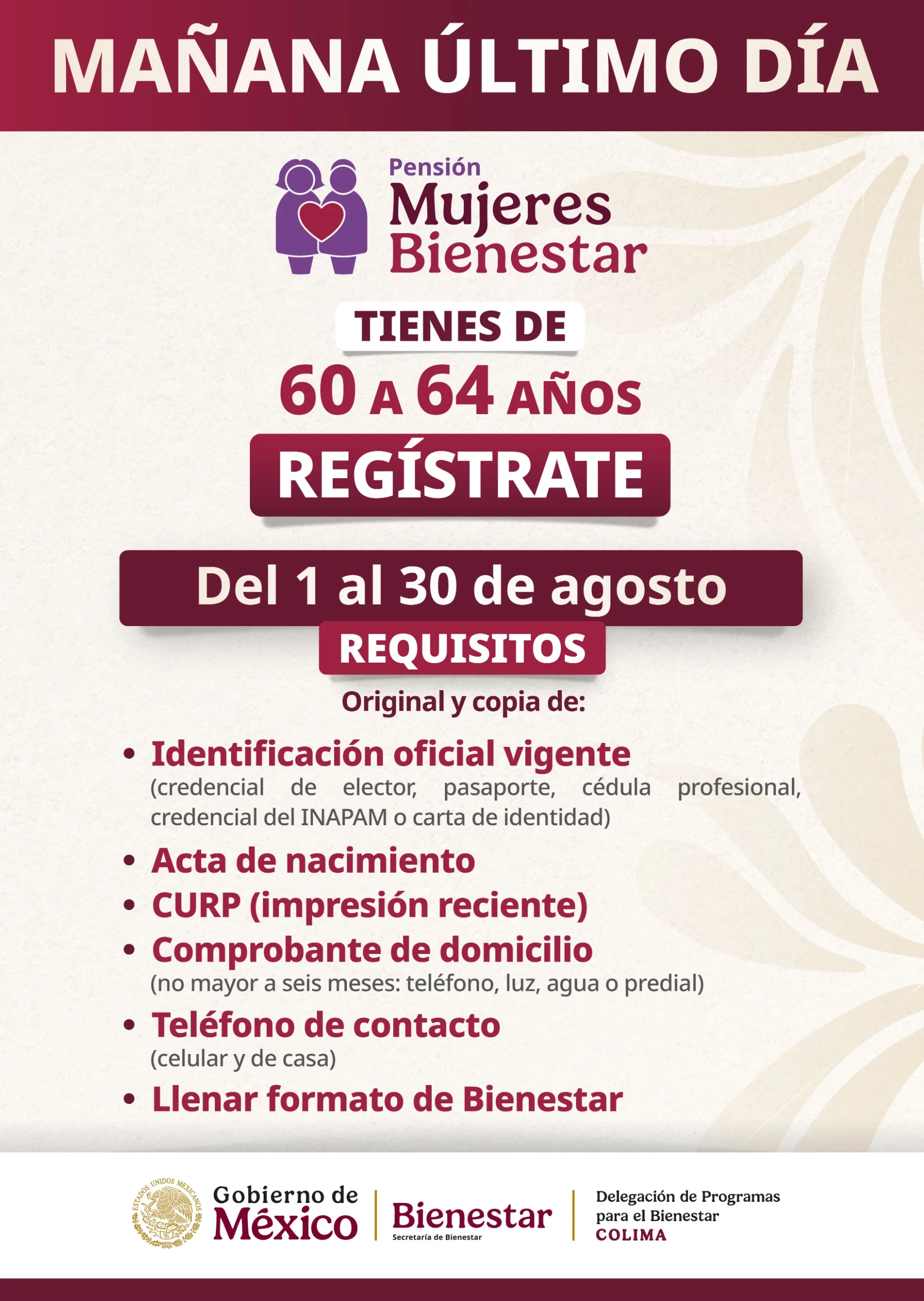 Añadió que faltan dos días para que concluya el registro a la pensión, por lo que las invitó a acudir a cualquiera de los 2 mil 400 Módulos de Bienestar que brindan atención de lunes a sábado en todo el país. Para conocer la ubicación se puede consultar la página oficial de la Secretaría de Bienestar: www.gob.mx/bienestar