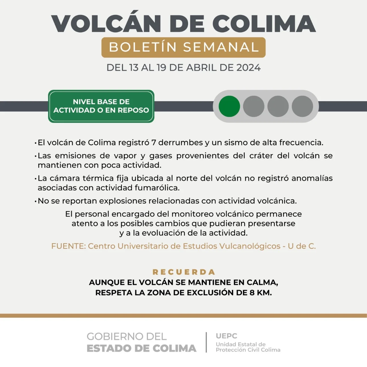 La UEPC destacó que, aunque el semáforo del Volcán de Colima se mantiene en color verde, la zona de exclusión es de ocho kilómetros, por lo que hizo un llamado a la población a respetar esta delimitación, para evitar situaciones de emergencia.