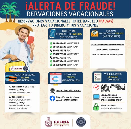 La Policía Cibernética Colima alerta sobre reservaciones falsas vinculadas a cadenas hoteleras. Se han detectado canales de venta NO oficiales que ofrecen promociones engañosas para captar a usuarios.
