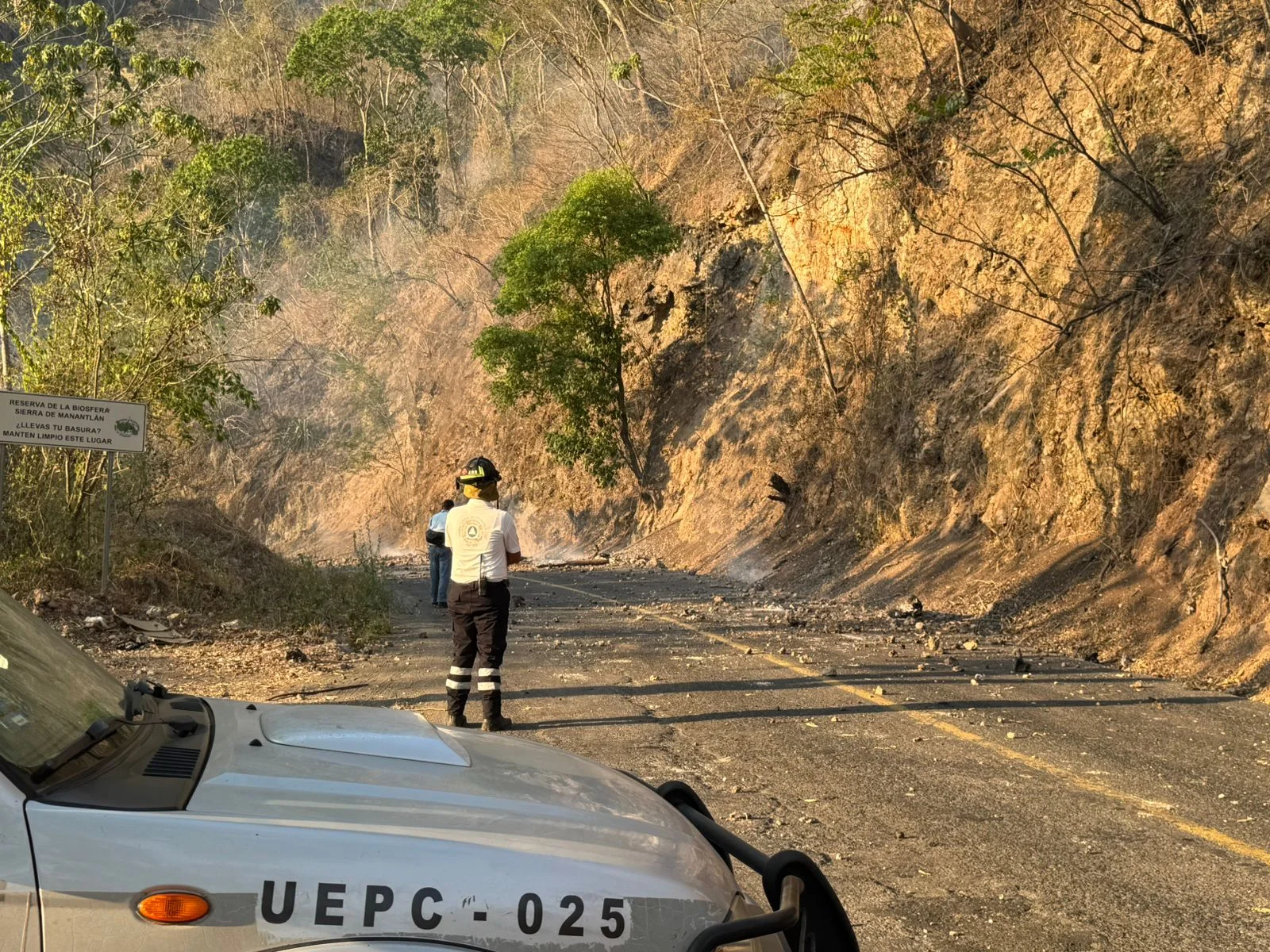 Como consecuencia de este incendio forestal, se registra caída de material en el tramo del kilómetro 33 sobre la vía Villa de Álvarez a Minatitlán, lo que representa un riesgo para quienes transitan por esta carretera intermunicipal.