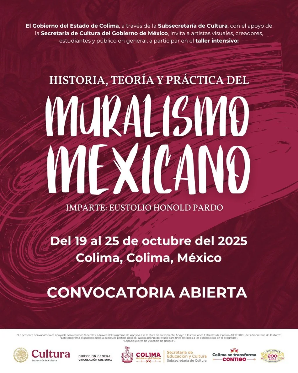 La Subsecretaría de Cultura del Gobierno del Estado de Colima, con apoyo de la Secretaría de Cultura del Gobierno de México, publica la convocatoria para el taller intensivo Historia, teoría y práctica del Muralismo Mexicano, que será impartido por Eustolio Pardo, artista de reconocida trayectoria internacional, del 19 al 25 de octubre en el Centro de Producción y Artes Gráficas ‘La Parota’, ubicado en el Centro Estatal de las Artes, en el Pueblo Mágico de Comala.