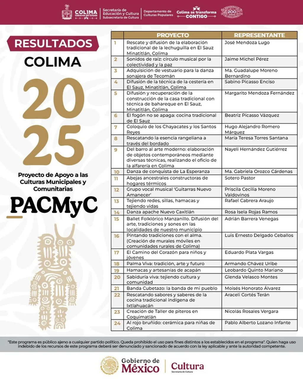La Subsecretaría de Cultura del Gobierno del Estado de Colima, en coordinación con la Secretaría de Cultura del Gobierno de México, dan a conocer los resultados de la convocatoria al Programa de Apoyos a las Culturas Municipales y Comunitarias (PACMyC) 2025, con un total de 24 proyectos seleccionados, enfocados en el rescate, preservación y difusión de prácticas artísticas tradicionales.