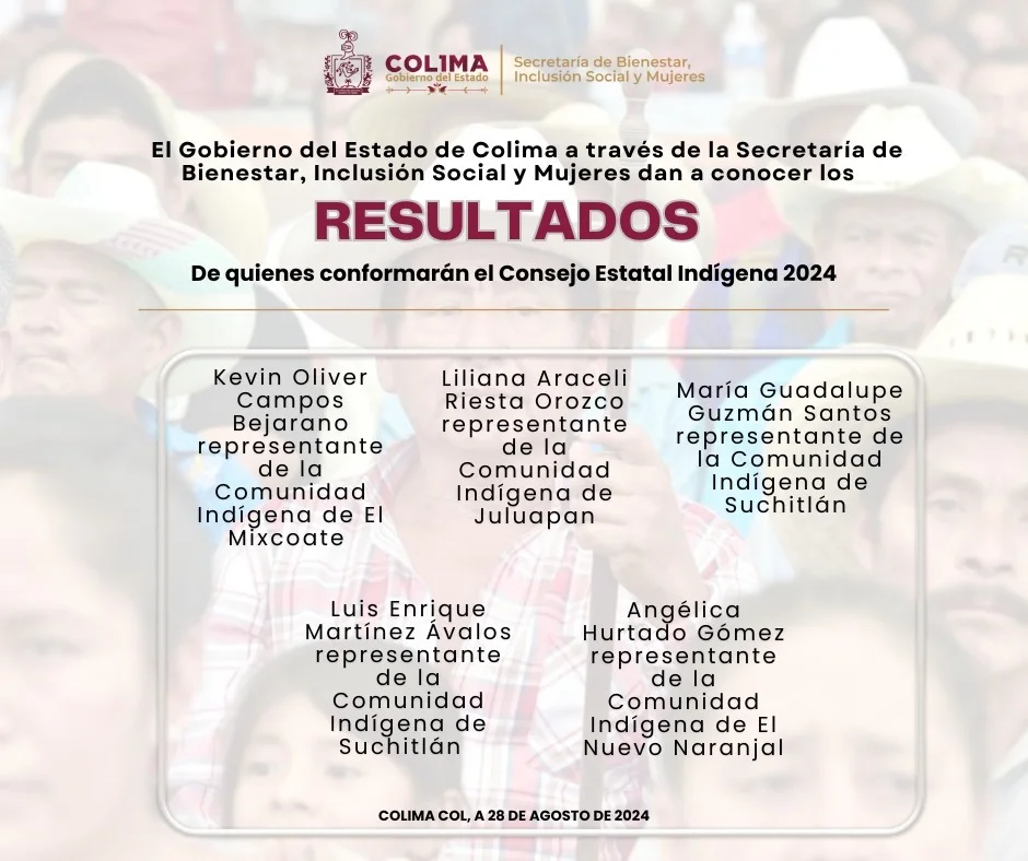 La Secretaría de Bienestar, Inclusión Social y Mujeres (Sebiinsom) del Gobierno del Estado de Colima da a conocer los nombres de las personas designadas como representantes de sus respectivos núcleos comunitarios en el Consejo Estatal Indígena, que participaron en la convocatoria pública 2024.