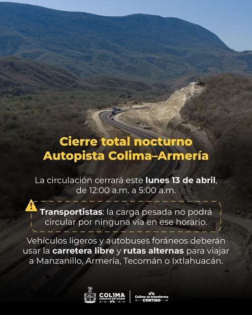 La Secretaría de Infraestructura, Desarrollo Urbano y Movilidad informa que durante la madrugada de este lunes 13 de abril se realizarán trabajos nocturnos de alta precisión en la autopista Colima–Manzanillo, en la zona conocida como La Salada (km 20+400).