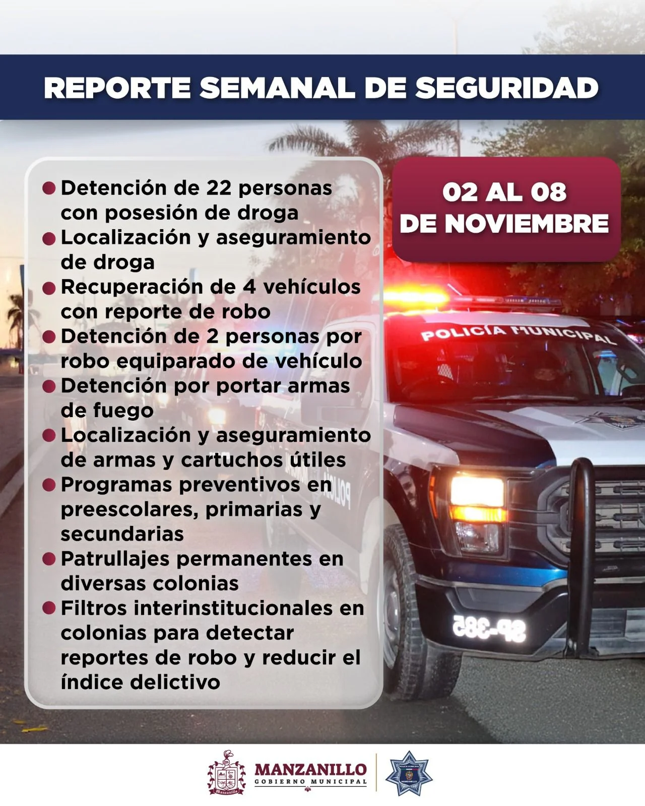 La Dirección de Seguridad Pública de Manzanillo informa que, como parte de las acciones permanentes de prevención y vigilancia en el municipio, durante la semana pasada se logró la detención de 22 personas por posesión de sustancias ilícitas.