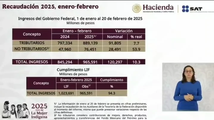 Hasta el día de ayer en comparación con el mismo periodo de enero y febrero 2024, recaudando 120 mil millones de pesos más, de un total de 1 billón 965,591. La Dra. Sheinbaum destacó “Cuando no hay corrupción, cuando no hay privilegios, cuando todo mundo cumplimos con la ley, pues se tienen buenos resultados”.📈🇲🇽