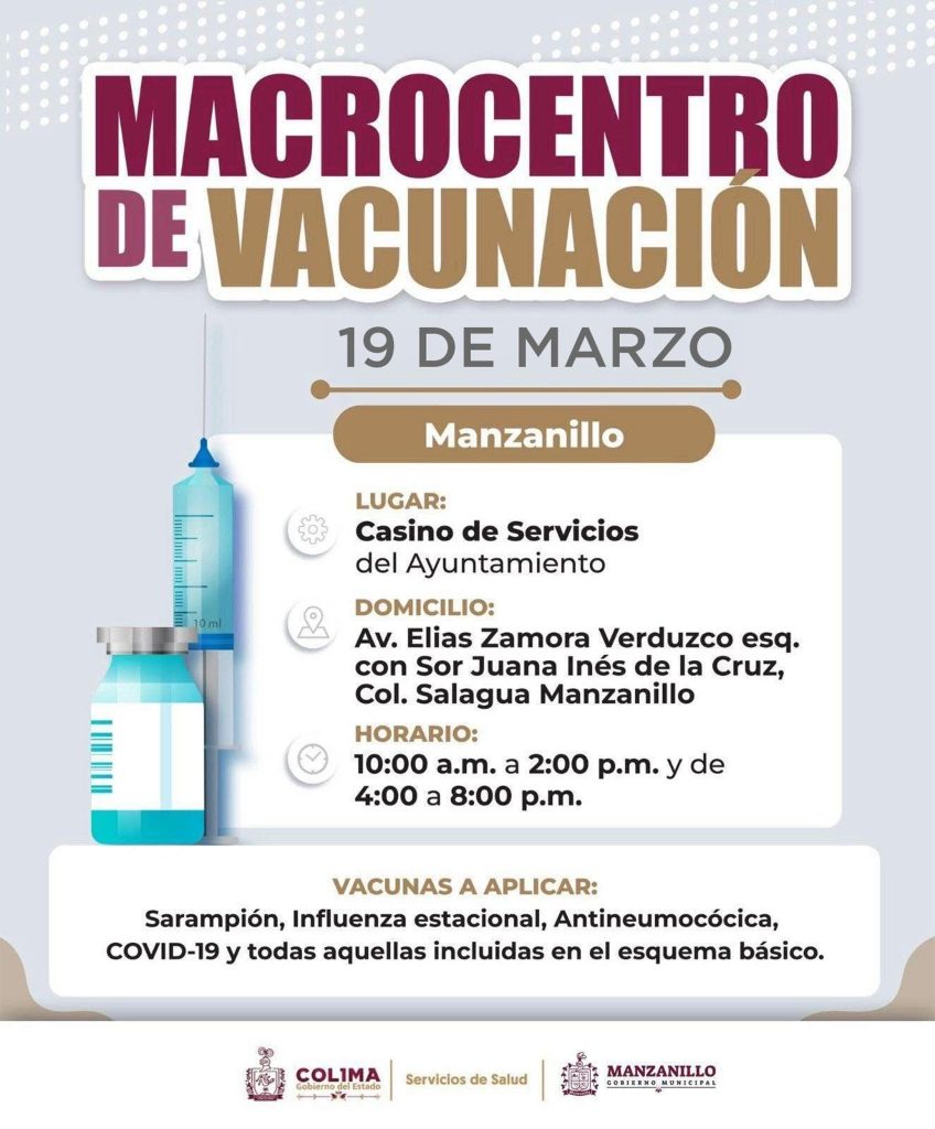 Mañana, jueves 19 de marzo, aprovecha y acude al Casino de la Feria, donde estarán disponibles vacunas de sarampión, influenza estacional, antineumocócica, COVID-19 y todas las incluidas en el esquema básico.