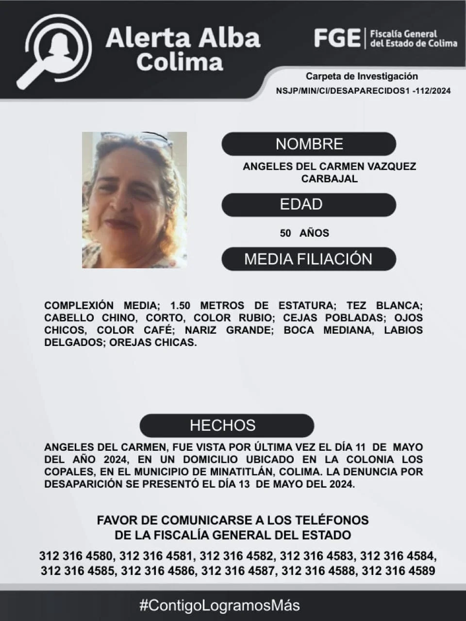 Favor de comunicarse a los teléfonos de la Fiscalía General del Estado. 312 316 45 80, 312 316 45 81, 312 316 45 82, 312 316 45 83, 312 316 45 84, 312 316 45 85, 312 316 45 86, 312 316 45 87, 312 316 45 88, 312 316 45 89.