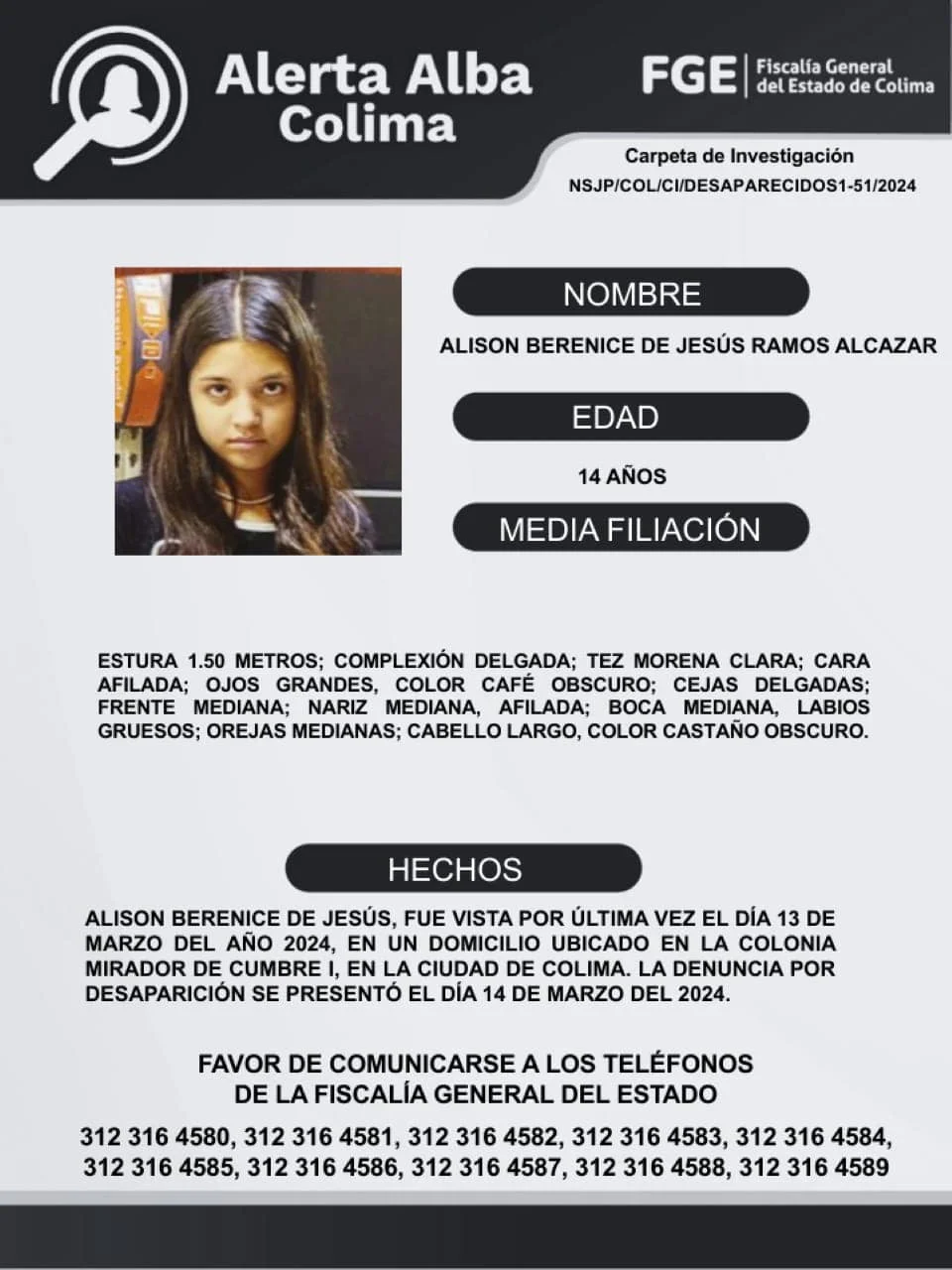 El Protocolo Estatal Alerta Alba, solicita su apoyo y colaboración para difundir los datos de esta persona que no han sido localizados.Favor de comunicarse a los teléfonos de la Fiscalía General del Estado. 312 316 45 80, 312 316 45 81, 312 316 45 82, 312 316 45 83, 312 316 45 84, 312 316 45 85, 312 316 45 86, 312 316 45 87, 312 316 45 88, 312 316 45 89.