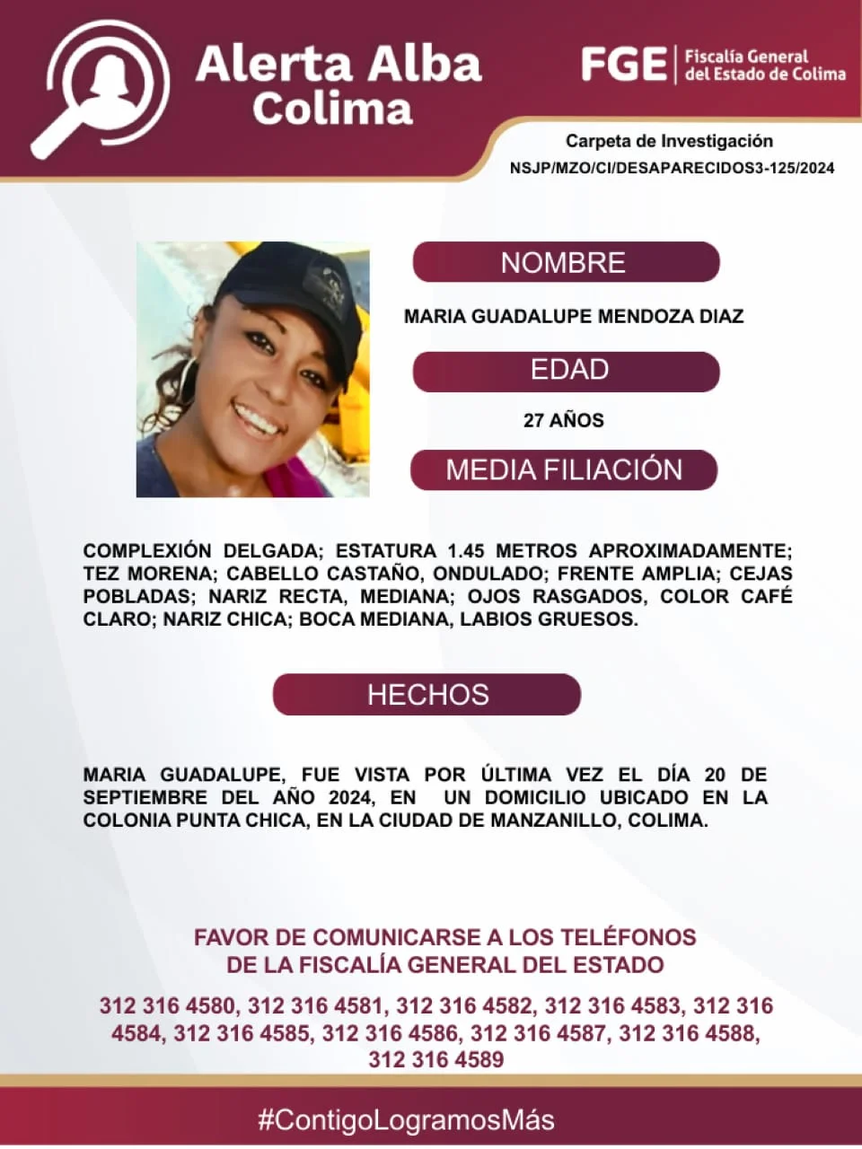 Favor de comunicarse a los teléfonos de la Fiscalía General del Estado. 312 316 45 80, 312 316 45 81, 312 316 45 82, 312 316 45 83, 312 316 45 84, 312 316 45 85, 312 316 45 86, 312 316 45 87, 312 316 45 88, 312 316 45 89.