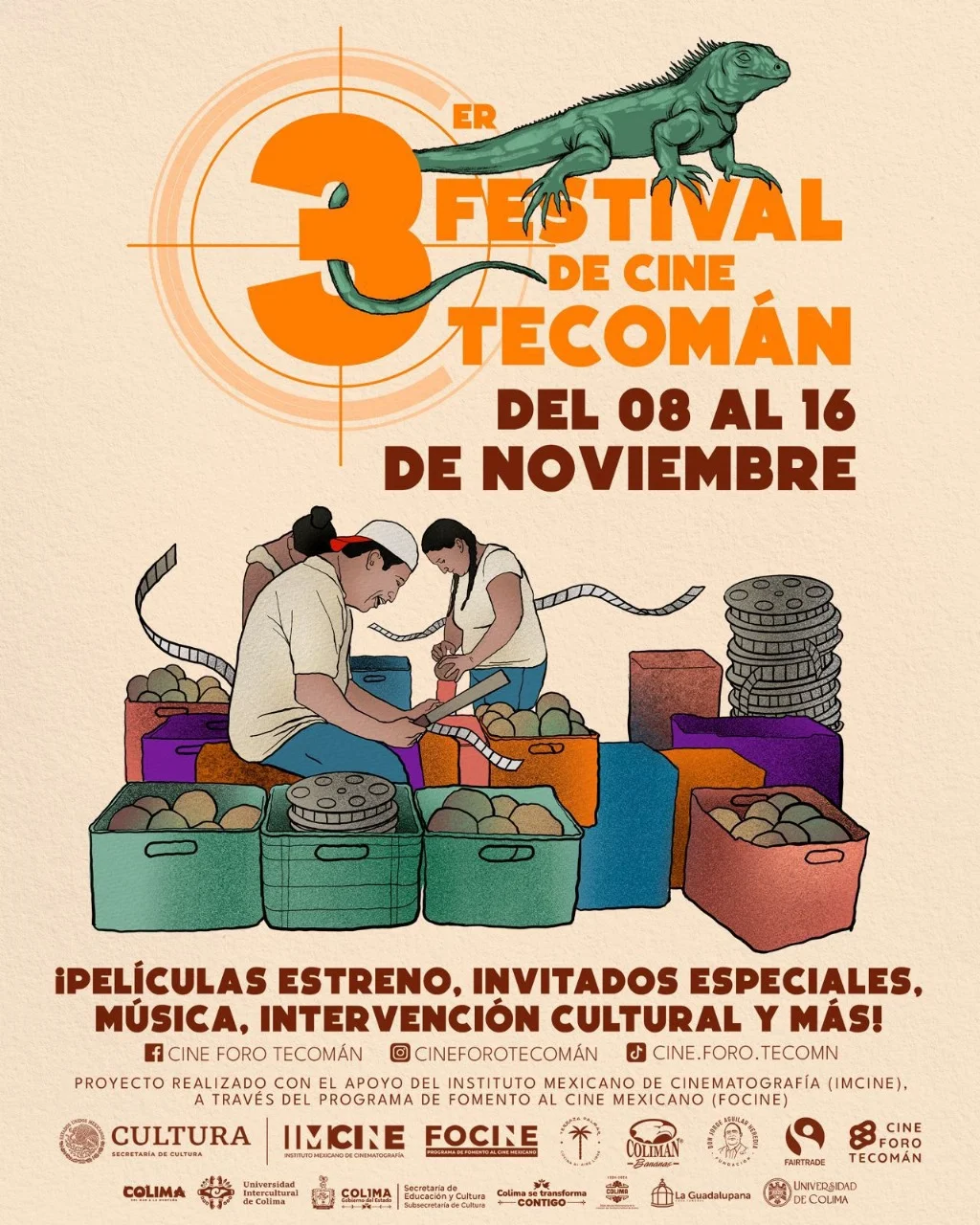 Con el apoyo de Fomento al Cine Mexicano (Focine), la iniciativa privada y otras dependencias del Gobierno del Estado de Colima, como las subsecretarías de Cultura y Turismo, todas las actividades serán gratuitas, celebrando la creatividad y el talento en un evento que refuerza la identidad cultural de Tecomán y Colima. El programa completo está disponible en redes sociales de @cineforotecoman y datos de contacto con la productora Lidia Martínez al teléfono 313-961-5890 o al correo electrónico idiaarroyo881@gmail.com