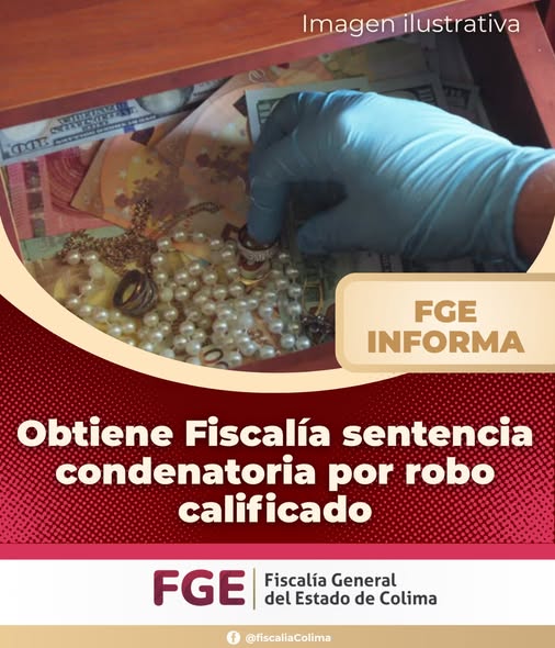 La responsable fue sentenciada a 3 años de prisión y al pago de la reparación del daño La Fiscalía General del Estado (FGE) informa que, como resultado de las pruebas desahogadas en audiencia de juicio oral, se obtuvo sentencia condenatoria en contra de Sandy Verónica “N” por su responsabilidad en el delito de robo calificado. De acuerdo con los hechos, la sentenciada laboró como empleada doméstica en un domicilio ubicado en el fraccionamiento Real Hacienda, en el municipio de Villa de Ílvarez, periodo durante el cual aprovechó el acceso a la vivienda para apoderarse de diversas alhajas, principalmente de oro, propiedad de las víctimas. Tras ser confrontada, reconoció los hechos y entregó algunas boletas de empeño relacionadas con los objetos sustraídos