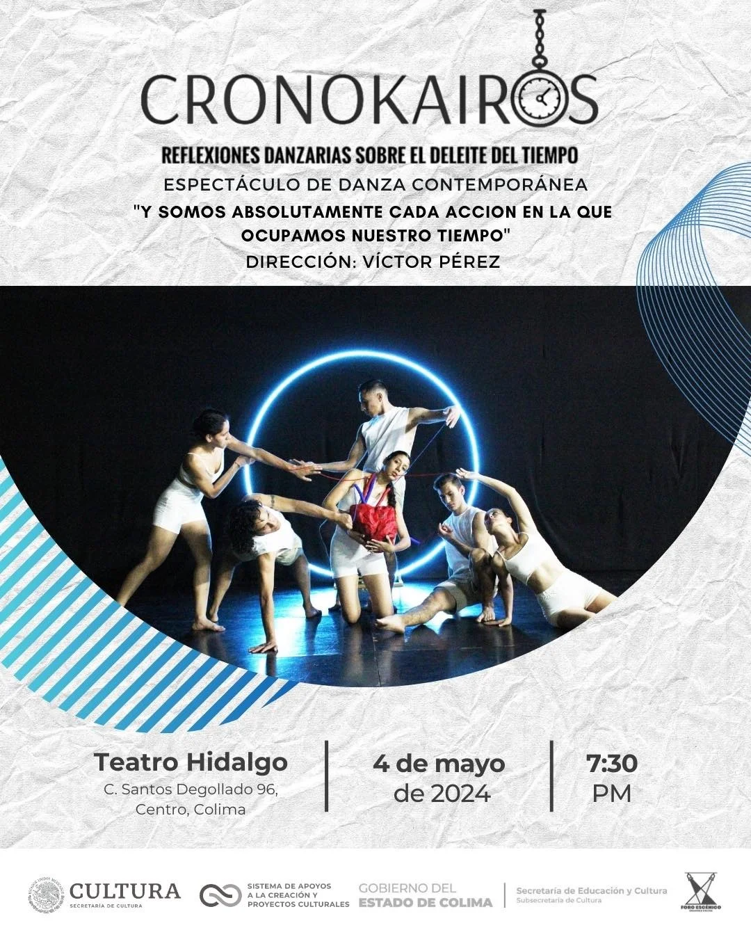 Este fin de semana en el Teatro Hidalgo de Colima las y los amantes del arte y la cultura podrán disfrutar del nuevo talento artístico del estado, con la puesta en escena ‘Cronokairos: reflexiones danzarias sobre el deleite del tiempo’, dirigida por Víctor Pérez.