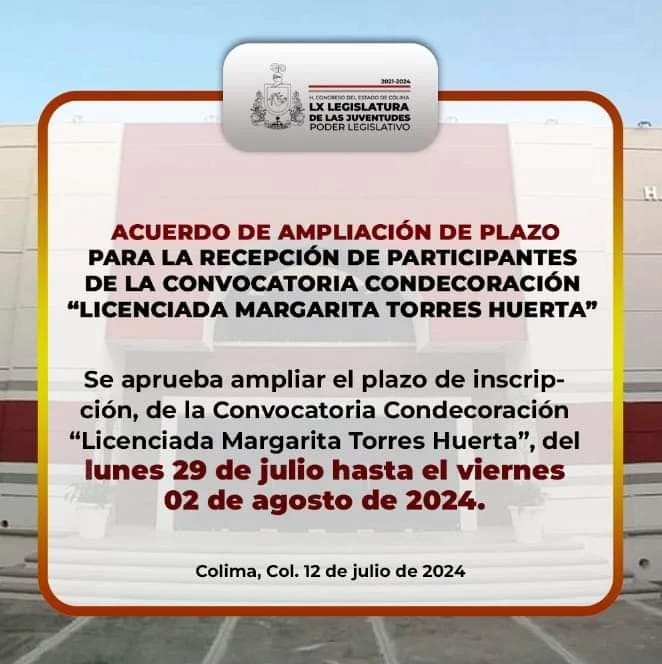 La Sexagésima Legislatura del H. Congreso del Estado de Colima convoca a las Barras, Colegios y Asociaciones de Abogados y Abogadas, a la Ciudadanía en General, y en especial a los Licenciados y Licenciadas en Derecho, para que participen, o bien inscriban, a aquellas personas distinguidas del área de derecho que sean merecedoras de la Condecoración “Licenciada Margarita Torres Huerta”, en su primera edición, cuyas bases tienen como objetivo reconocer a distinguidas abogadas y abogados, que hayan contribuido a fortalecer y dignificar la profesión jurídica en beneficio de la sociedad colimense, en las siguientes categorías: