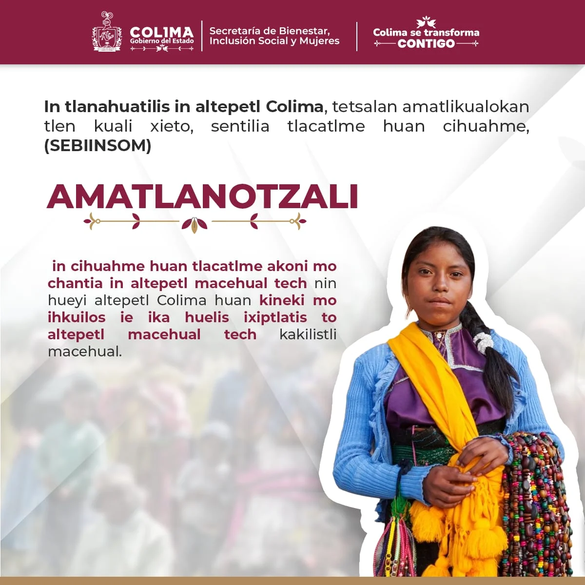La Secretaría de Bienestar, Inclusión Social y Mujeres (Sebiinsom) del Gobierno del Estado de Colima, informa que este viernes 9 de agosto cerrará los registros para participar en la Convocatoria Pública 2024, para mujeres y hombres pertenecientes a pueblos o comunidades indígenas en la entidad, que deseen participar en el proceso de designación de representantes de sus respectivos núcleos comunitarios, en el Consejo Estatal Indígena.