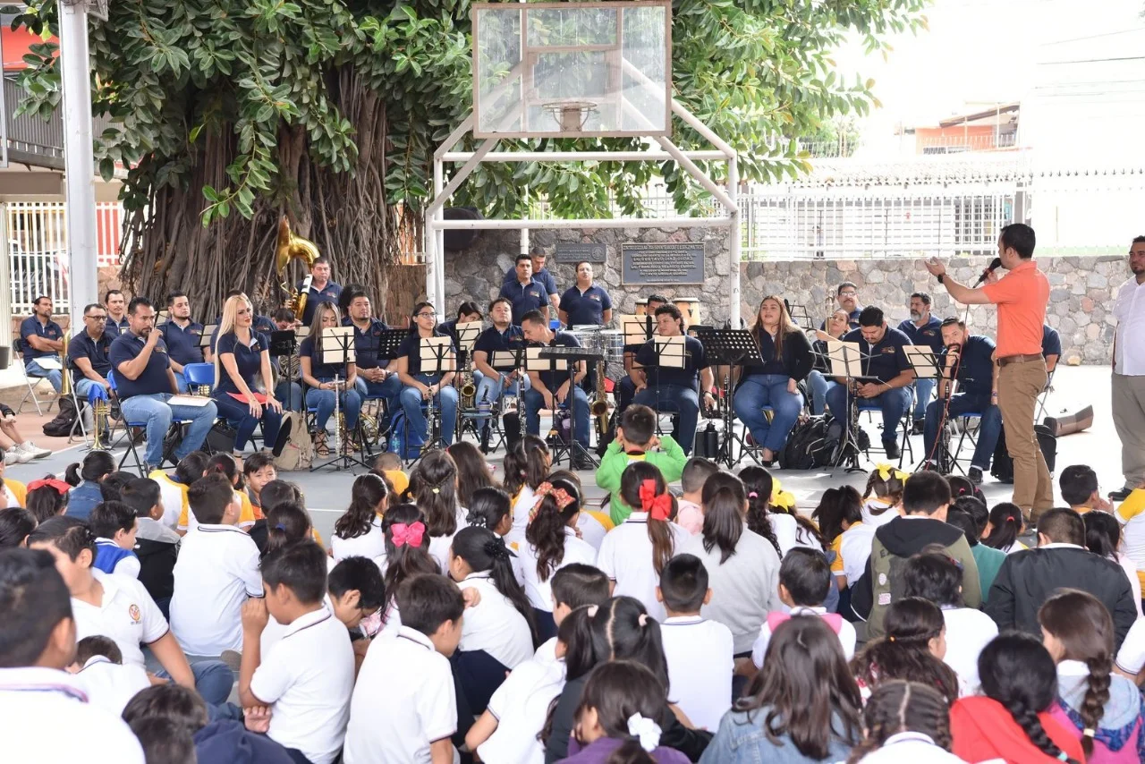 Alumnas, alumnos, plantilla docente, así como personal directivo y administrativo de la escuela primaria ‘Adolfo López Mateos’ turno matutino en el municipio capitalino, disfrutaron de un agradable concierto didáctico que les ofreció la Banda Sinfónica del Gobierno del Estado de Colima, que dirige la maestra Perla Cortés, como parte de la Brigada de Arte y Tradición en Territorio Escolar y Centros de Atención Prioritaria, organizada por la Subsecretaría de Cultura.
