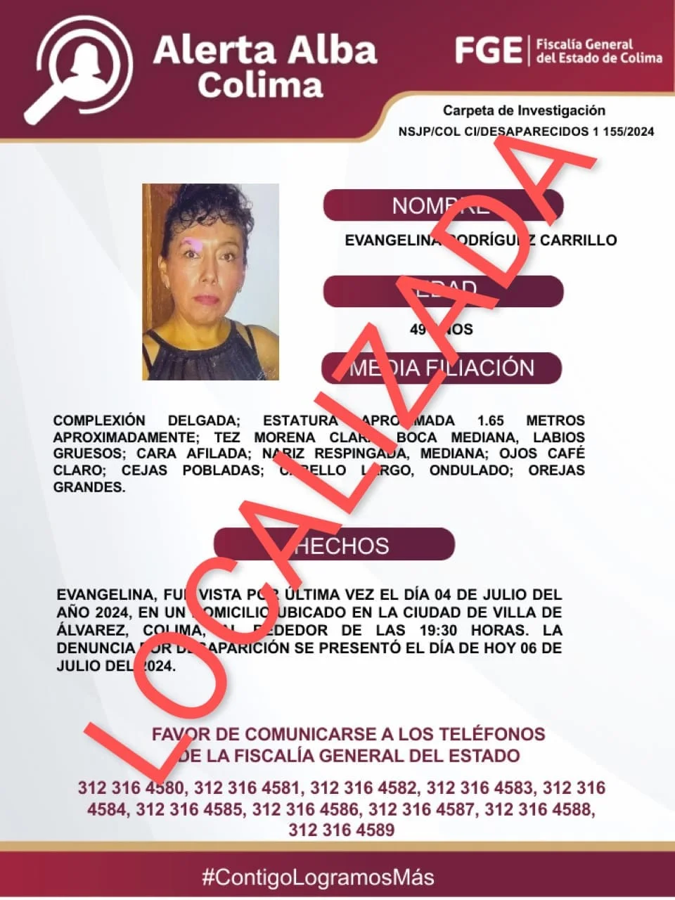 Evangelina ya fue localizada. El Protocolo Alerta Alba agradece el apoyo de medios de comunicación y la colaboración de la sociedad mediante llamadas a las líneas 089 y 911, así como la información que se compartió a través de redes sociales.