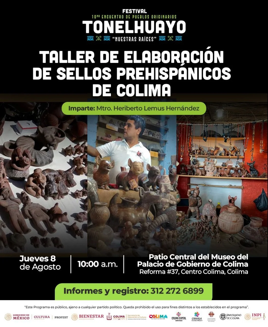 Ambos talleres se impartirán de manera gratuita, gracias al trabajo coordinado de la Subsecretaría de Cultura del Gobierno del Estado de Colima y la Secretaría de Cultura del Gobierno de México, a través del Programa de Apoyo a Festivales Culturales y Artísticos, y se impartirán el jueves 8 de agosto a las 10:00 de la mañana en el Museo del Palacio de Gobierno de Colima. Las personas interesadas podrán pedir informes y registrarse al 312-272-68-99.