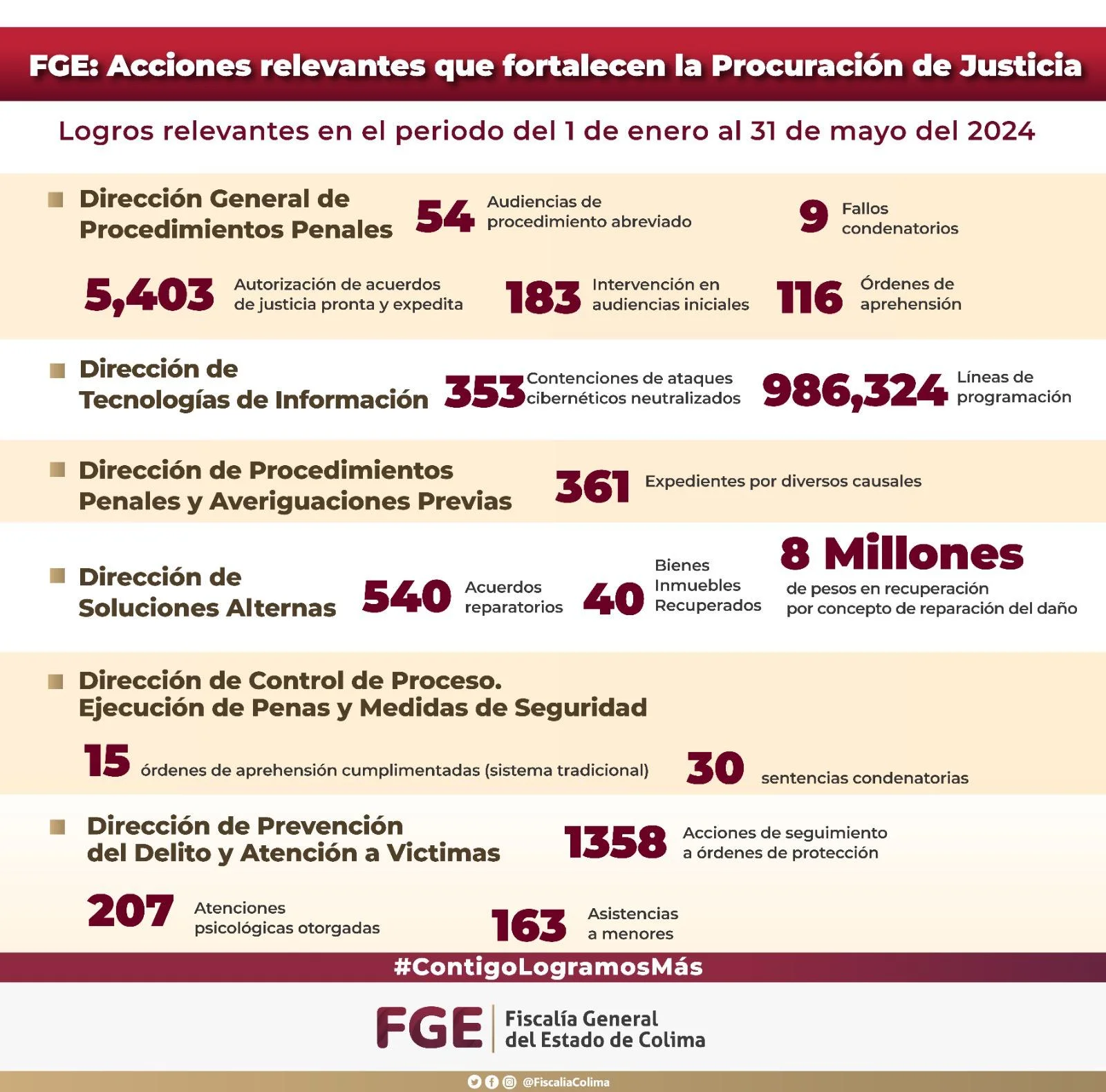 García Ramírez informa estos logros relevantes de las áreas adscritas a la Fiscalía General del Estado (FGE) y que forman parte de la campaña informativa permanente denominada “Entérate”, en el periodo del 1 de enero al 31 de mayo del 2024.