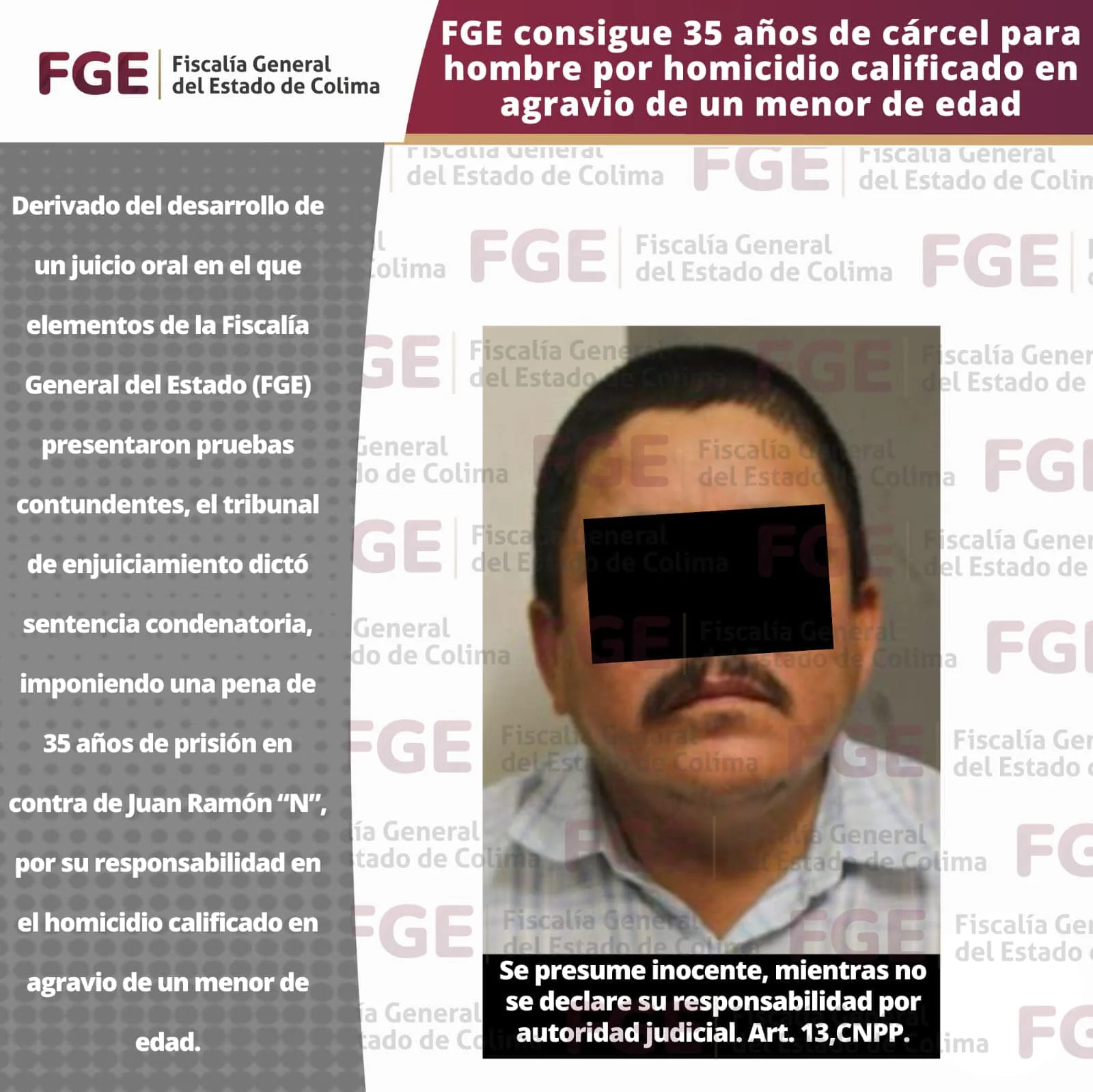 Derivado del desarrollo de un juicio oral en el que elementos de la Fiscalía General del Estado (FGE) presentaron pruebas contundentes, el tribunal de enjuiciamiento dictó sentencia condenatoria, imponiendo una pena de 35 años de prisión en contra de Juan Ramón “N”, por su responsabilidad en el homicidio calificado en agravio de un menor de edad.