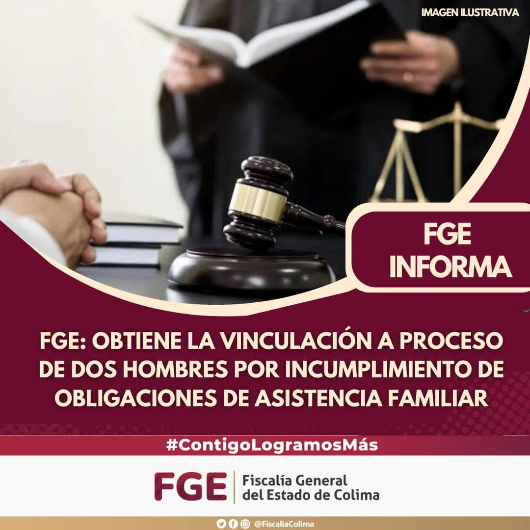 La Fiscalía General del Estado (FGE), a través de la Fiscalía Especializada en Delitos por Razones de Género y Trata de Personas, obtuvo la vinculación a proceso en contra de Iovani “N” y Gerardo “N”, por el hecho constitutivo del delito de incumplimiento de las obligaciones de asistencia familiar, en distintos hechos ocurridos en los municipios de Colima y Manzanillo.
