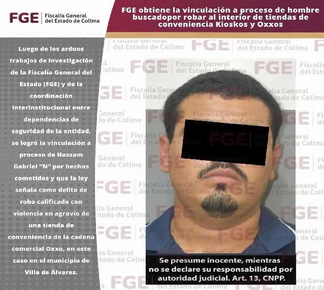 Luego de los arduos trabajos de investigación de la Fiscalía General del Estado (FGE) y de la coordinación interinstitucional entre dependencias de seguridad de la entidad, se logró la vinculación a proceso de Hassam Gabriel “N” por hechos cometidos y que la ley señala como delito de robo calificado con violencia en agravio de una tienda de conveniencia de la cadena comercial Oxxo, en este caso en el municipio de Villa de Ãlvarez.