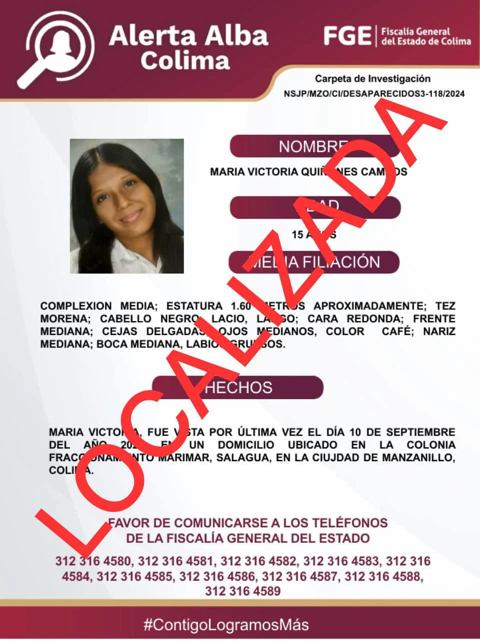 María Victoria ya fue localizada. El Protocolo Alerta Alba agradece el apoyo de medios de comunicación y la colaboración de la sociedad mediante llamadas a las líneas 089 y 911, así como la información que se compartió a través de redes sociales.