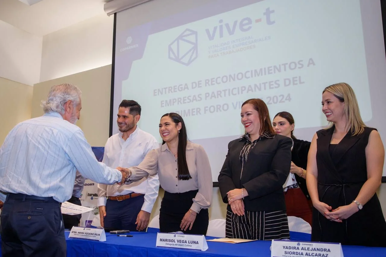 La gobernadora Indira Vizcaíno Silva participó este jueves en la reunión mensual de la Confederación Patronal de la República Mexicana (Coparmex) en Colima, donde entregaron reconocimientos a empresas participantes del Primer Foro VIVE-T 2024 -Vitalidad Integral y Valores Empresariales para Trabajadores-; también la Delegación Estatal del Infonavit entregó reconocimientos a empresas de diez, por su cumplimiento constante y permanente en el pago de sus obligaciones patronales.
