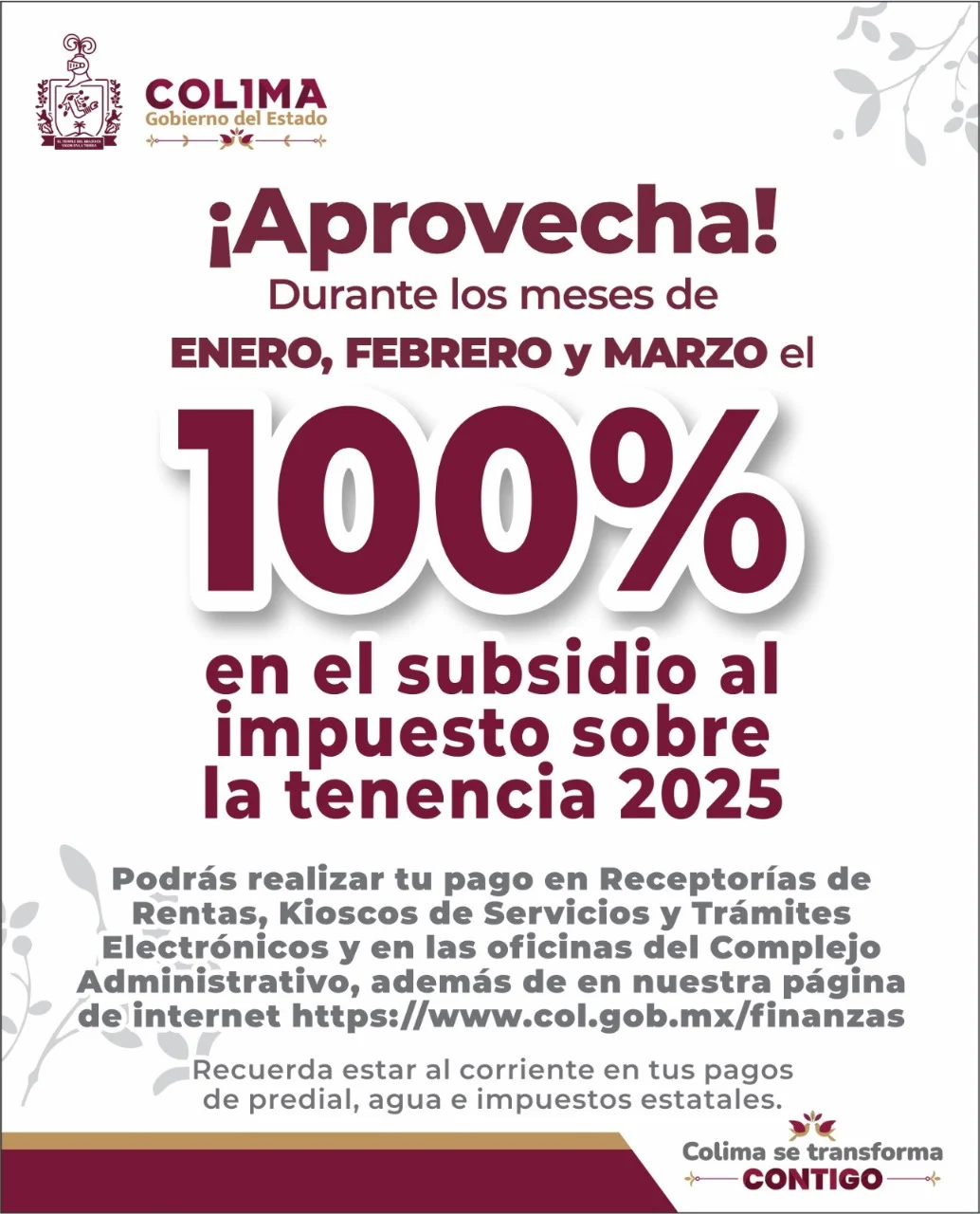 El Gobierno del Estado de Colima, a través de la Secretaría de Planeación, Finanzas y Administración (Seplafina), invita a ciudadanas y ciudadanos a aprovechar el cien por ciento en el subsidio al Impuesto sobre Tenencia –IST- en el ejercicio fiscal 2025, durante los meses de enero, febrero y marzo del presente año.