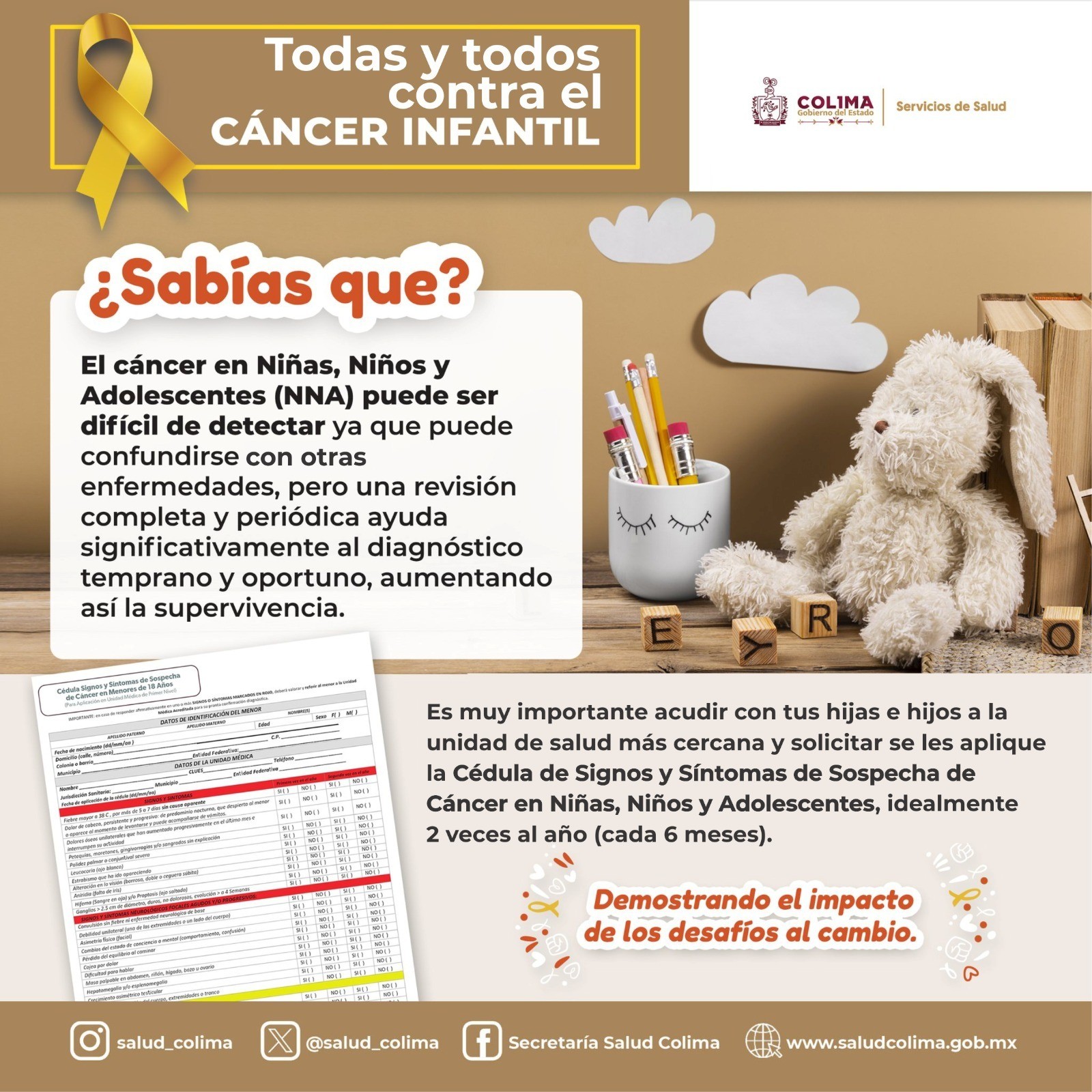 Gracias a la visión de la gobernadora Indira Vizcaíno Silva y su perspectiva preventiva a favor de las niñas, niños y adolescentes de la entidad, la Secretaría de Salud del Gobierno del Estado de Colima realiza la detección temprana de casos sospechosos de cáncer, mediante la aplicación de una cédula de signos y síntomas en todas y todos los menores de 18 años; estas acciones refuerzan la estrategia Operación Salud Tamizaje, implementada por la mandataria estatal, para fortalecer la atención médica la prevención de casos de esta enfermedad.