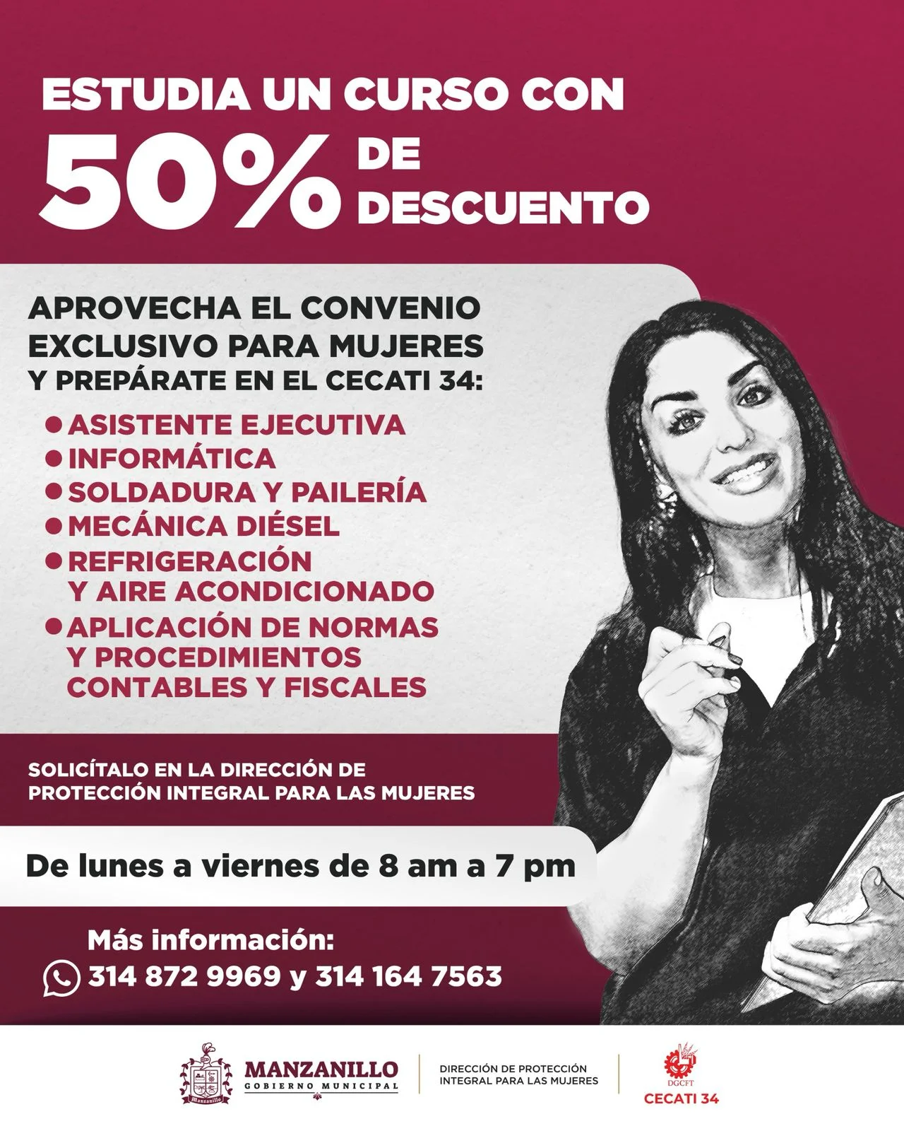 El Ayuntamiento de Manzanillo, a través de la Dirección de Protección Integral para las Mujeres, anunció un convenio con el CECATI No.34 que brindará a las mujeres del municipio la oportunidad de estudiar uno de sus cursos con un 50% de descuento. Este beneficio está diseñado para impulsar el desarrollo profesional y personal de todas, ofreciéndoles una formación de calidad en diversas áreas.