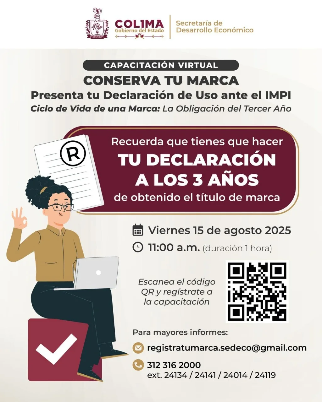El Gobierno del Estado de Colima, a través de la Secretaría de Desarrollo Económico (Sedeco), invita a las personas emprendedoras, empresarios y titulares de marcas registradas a participar en la capacitación virtual ‘Conserva tu marca: presenta tu declaración de uso ante el IMPI’, que se llevará a cabo este viernes 15 de agosto a partir de las 11:00 horas, con una duración aproximada de una hora.