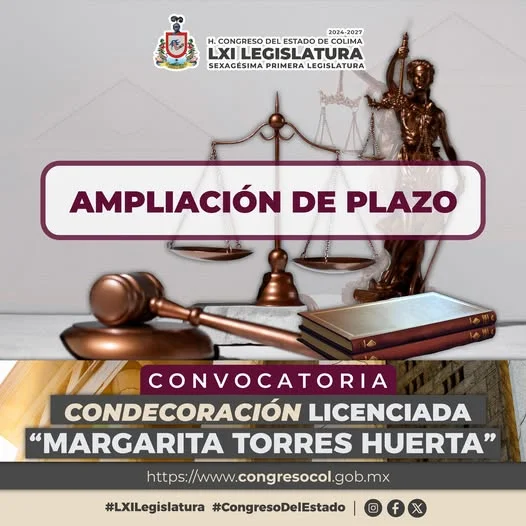 El Congreso del Estado de Colima, a través de las comisiones de Estudios Legislativos y Puntos Constitucionales y Educación, Cultura y Ciencia, emitió un acuerdo de ampliación de plazo para la recepción de documentos para la convocatoria al premio “Licenciada Margarita Torres Huerta” en su edición 2025.