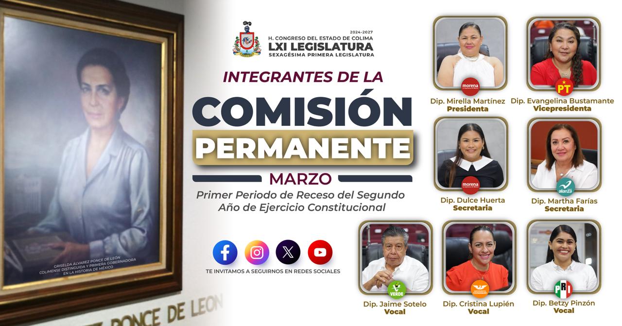 Te compartimos la integración de la Comisión Permanente, que llevará los trabajos legislativos en este mes de marzo, correspondiente al Primer Periodo de Receso del Segundo Año de Ejercicio Constitucional.