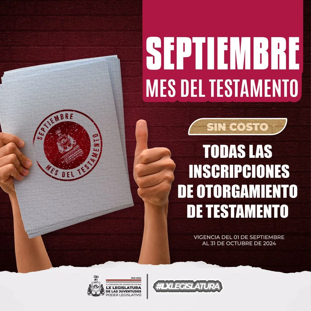 #MesDelTestamento | Las y los diputados aprobaron exentar el pago total del derecho por la inscripción de avisos de otorgamiento de testamento, con vigencia del 01 de septiembre al 31 de octubre de 2024.