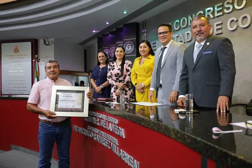 #SesiónSolemne | Se hace entrega del Premio Estatal al Cuidado del Medio Ambiente, edición 2025, en la categoría “BIODIVERSIDAD”, a la COMUNIDAD DE CANOAS, Manzanillo, mediante el C. MIGUEL FIGUEROA FIGUEROA, actual Comisario Ejidal de la comunidad, por la serie de acciones que llevaron a cabo a favor del reconocimiento y protección del Corredor Biológico Canoas-Manantlán.