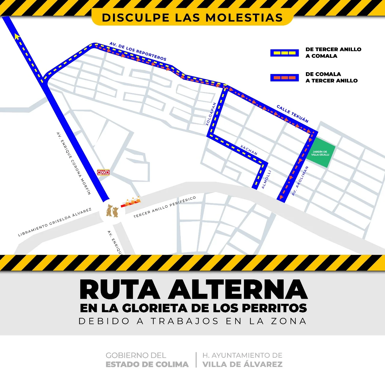 Se informa a la población que, ante la reducción de carriles en la ‘Glorieta de Los Perritos’, se habilitó una vía alterna para las personas usuarias que se trasladan desde Comala al municipio de Villa de Álvarez y viceversa.