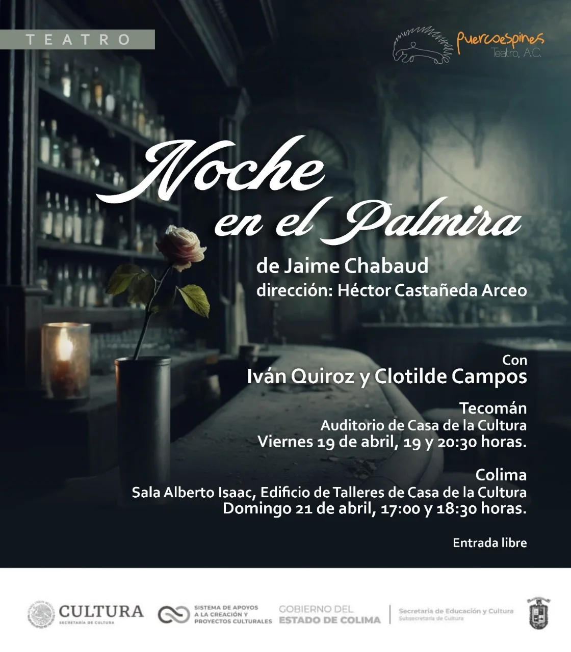 La población colimense podrá disfrutar este fin de semana la obra de teatro ‘Noche en el Palmira’, que tendrá doble función: el viernes 19 de abril a las 7:00 de la tarde y 8:30 de la noche, mientras que el domingo 21 de abril las presentaciones serán a las 5:00 y 6:30 de la tarde, todas en la sala Alberto Isaac, dentro del edificio de talleres en la Casa de la Cultura estatal, por Calzada Galván.