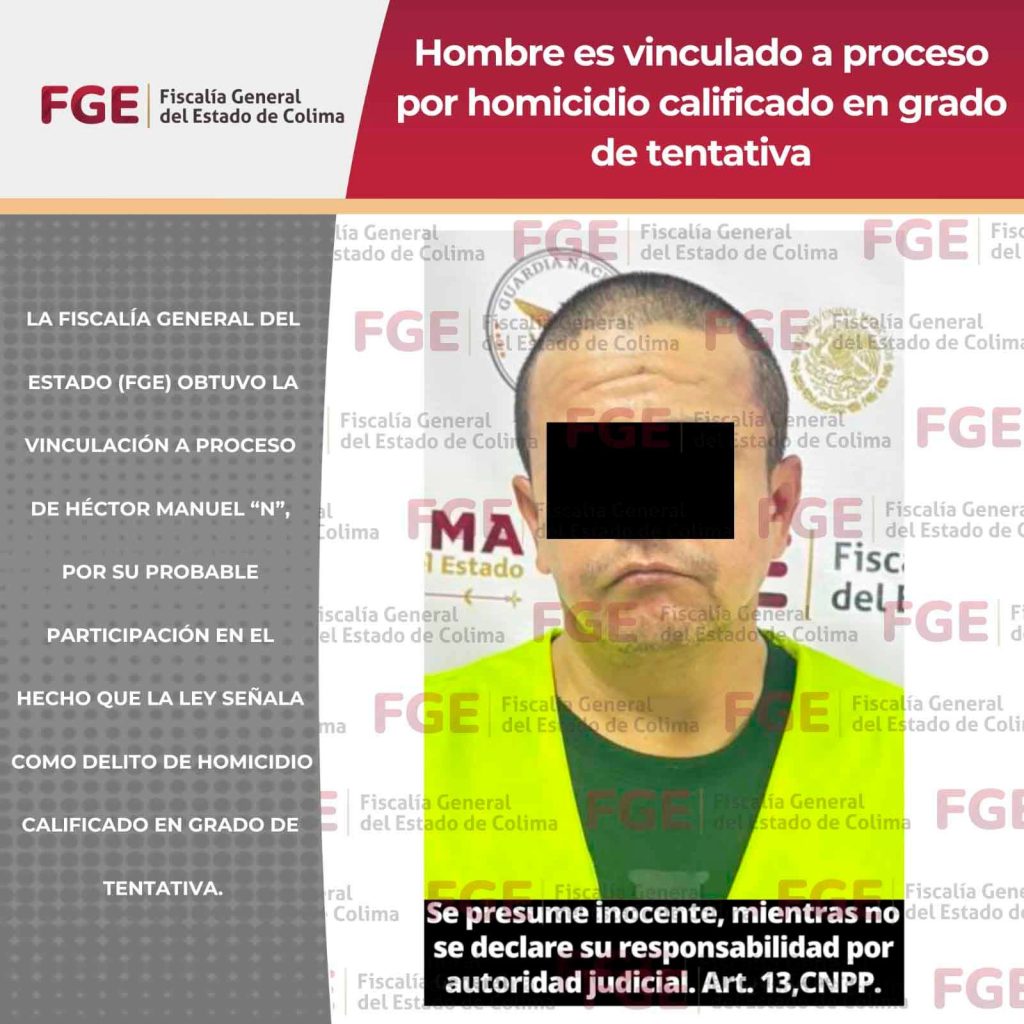 La Fiscalía General del Estado (FGE) obtuvo la vinculación a proceso de Héctor Manuel “N”, por su probable participación en el hecho que la ley señala como delito de homicidio calificado en grado de tentativa. De acuerdo con los datos de prueba que obran en la carpeta de investigación, el 07 de junio de 2025, la víctima se encontraba al interior de un domicilio ubicado en la colonia Mirador del Valle de las Garzas, en el municipio de Manzanillo. En ese lugar, el imputado presuntamente ingresó y accionó un arma de fuego en su contra mientras la víctima se encontraba dormida. Tras ser detenido mediante el cumplimiento de una orden de aprehensión, el imputado fue puesto a disposición del Juez de Control.