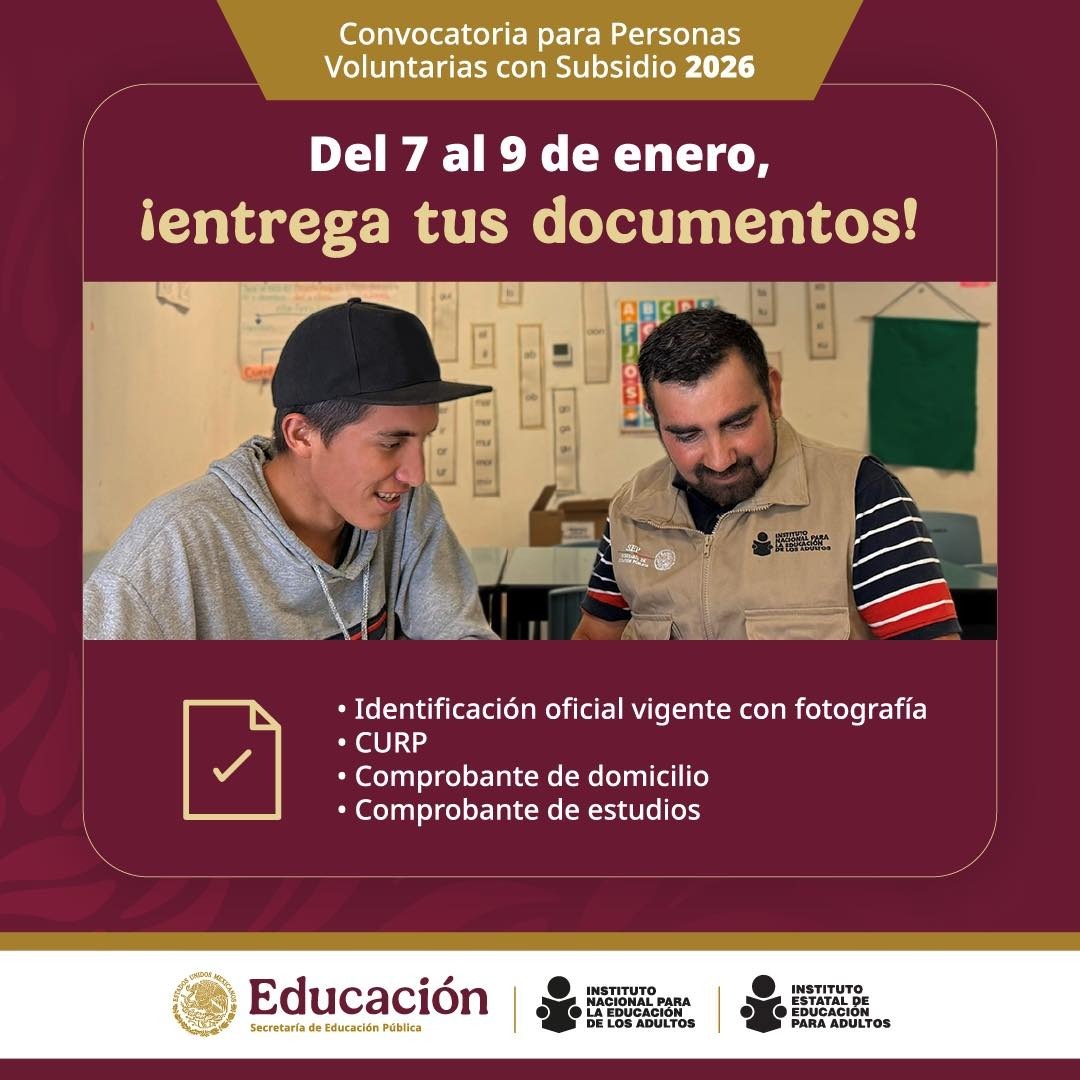 Las personas seleccionadas brindarán apoyo en alfabetización, primaria y secundaria que ofrece el Programa de Educación para Adultos a población de 15 años o más. Quienes aspiran deberán presentar en original y copia su identificación oficial vigente con fotografía, CURP, comprobantes de domicilio y de estudios. Sólo se recibirá documentación completa, legible y sin alteraciones que será cotejada al momento del registro.