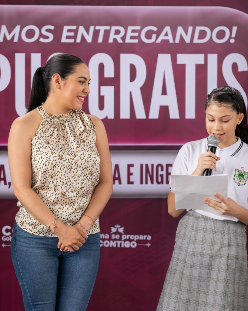 Araceli Sotomayor Radillo, a nombre de todas y todos los estudiantes beneficiarios, dijo sentirse muy honrada de tomar la palabra para expresar el agradecimiento de todos los estudiantes; “esto no sólo representa una herramienta tecnológica, es una forma distinta de aprender; este apoyo significa mucho para nosotros y nuestras familias, en un mundo donde la educación digital es cada vez más importante, gracias por invertir en nosotros: nos comprometemos a aprovechar este recurso y ser ciudadanos responsables”.