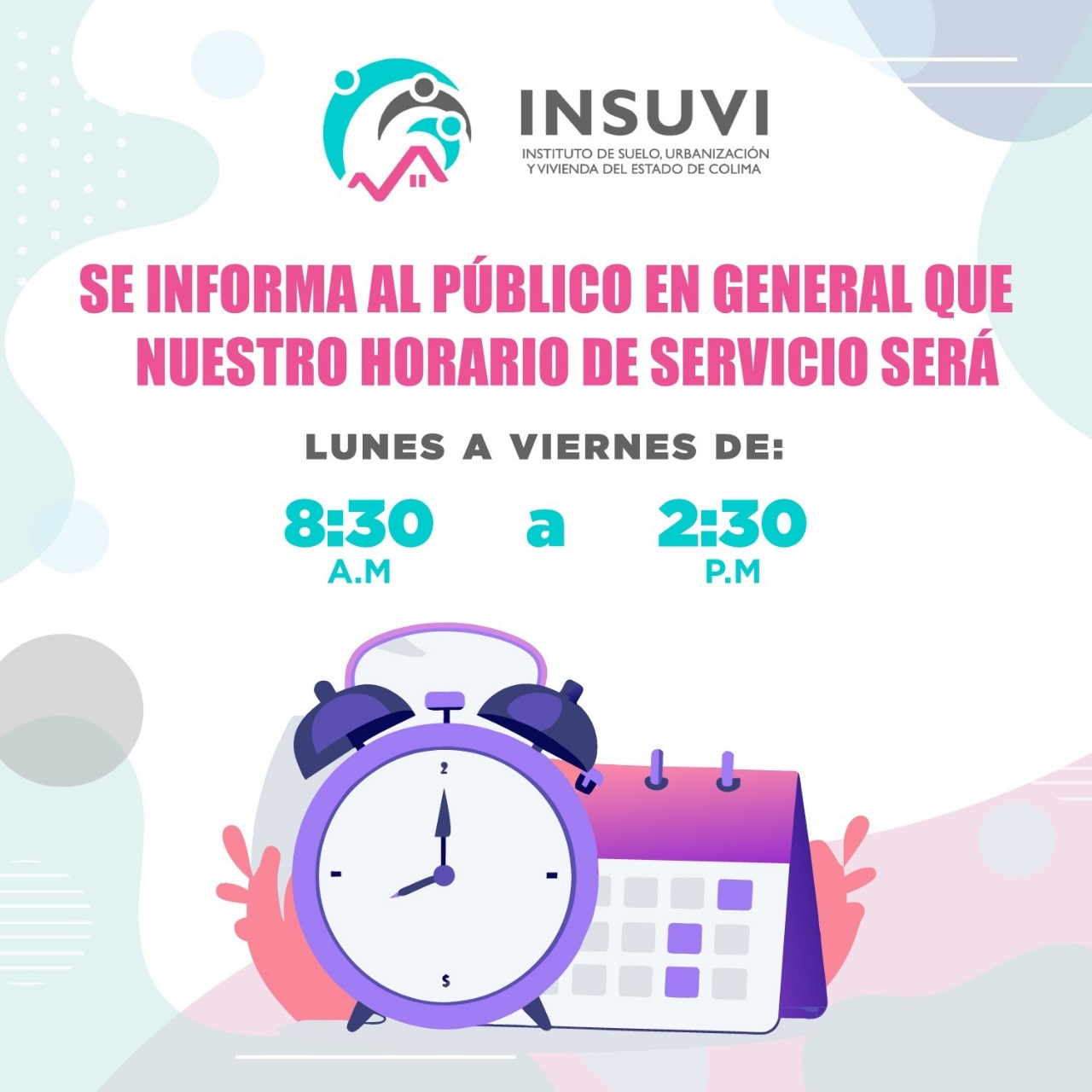 El Instituto de Suelo, Urbanización y Vivienda (Insuvi) en el estado de Colima, informa que, a partir de este lunes 21 de octubre, implementa un nuevo horario de atención para la recepción de pagos, el cual será de 8:30 de la mañana a 2:30 de la tarde, de lunes a viernes.