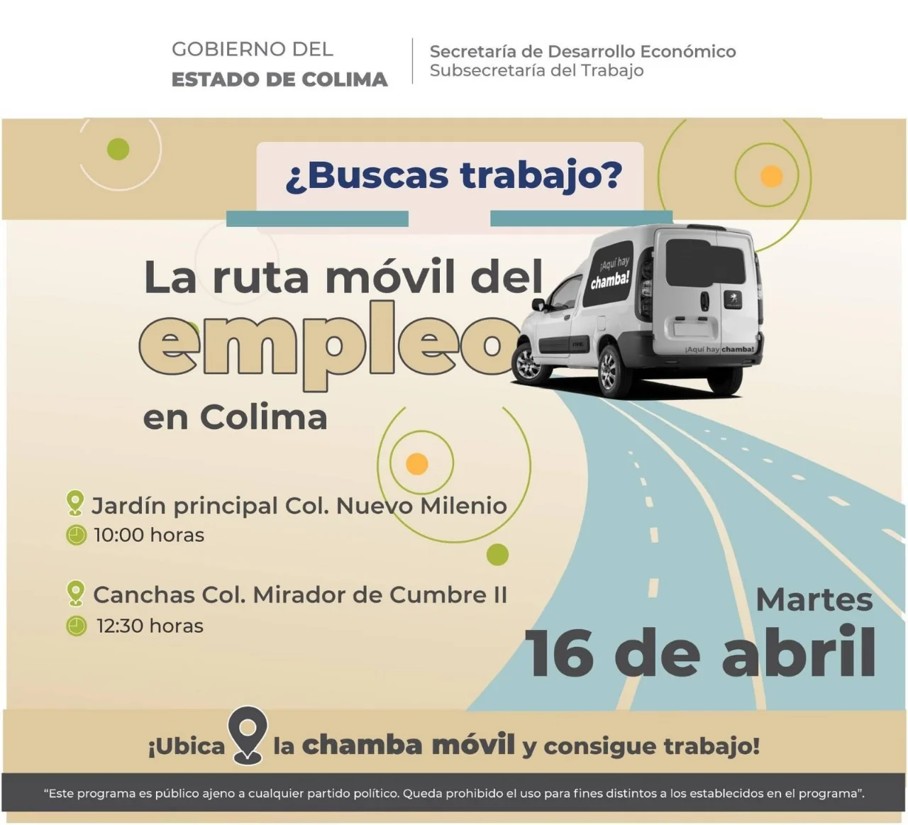 La #chambamóvilcolima estará en el jardín principal de la colonia Nuevo Milenio, a partir de las 10:00 de la mañana, y posteriormente, a partir de las 12:30 horas en las canchas techadas de la colonia Mirador de la Cumbre II. En un mismo día se visitarán ambas colonias, ofertando las vacantes disponibles para trabajar en empresas formales con las prestaciones de ley.