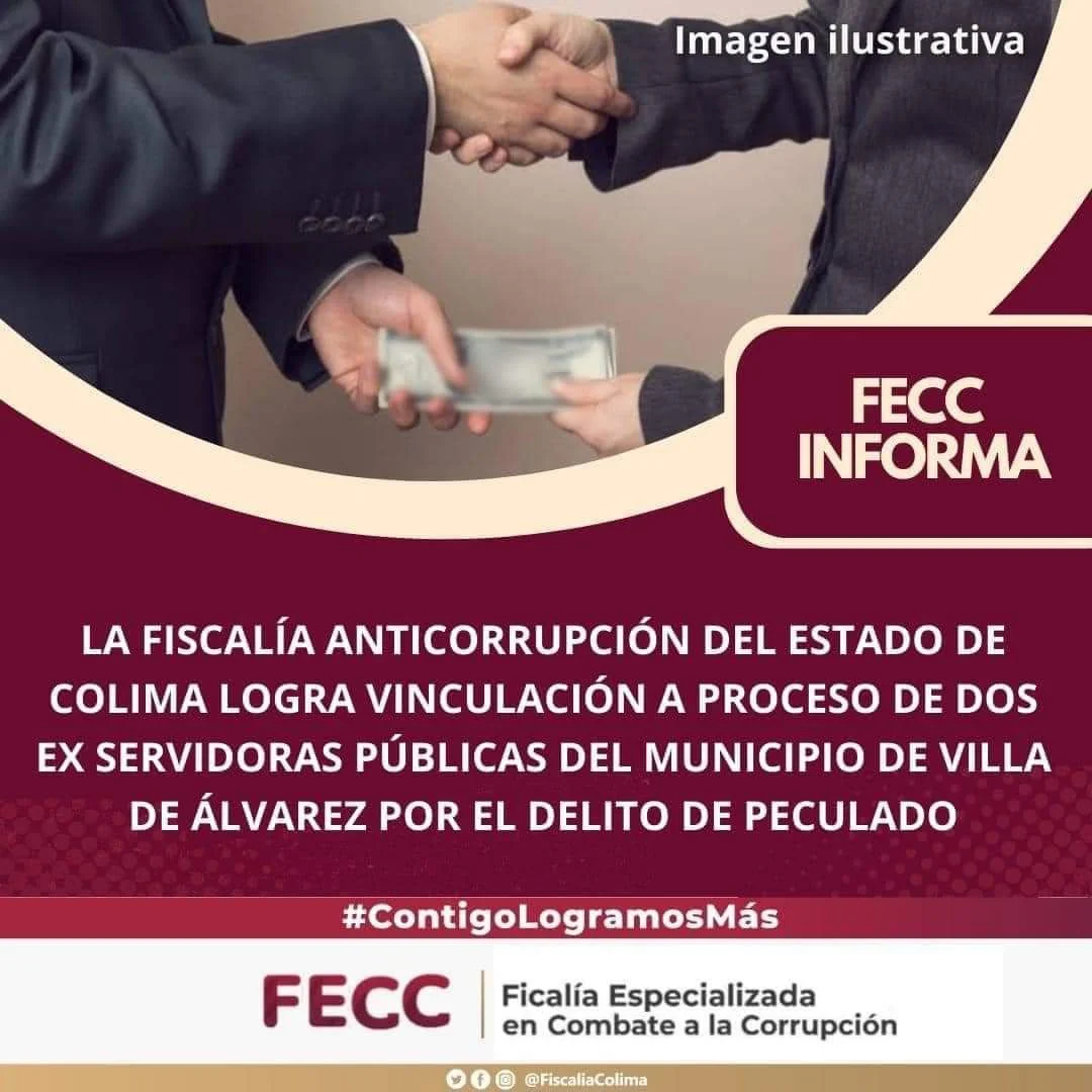 La Fiscalía Especializada en Combate a la Corrupción, obtuvo la vinculación a proceso en contra de “Yulenny N” y “Ma. de los Ángeles N”, ex servidoras públicas de ese Ayuntamiento por el hecho que la ley señala como delito de Peculado, previsto y sancionado en el artículo 237 BIS del Código Penal para el Estado de Colima.