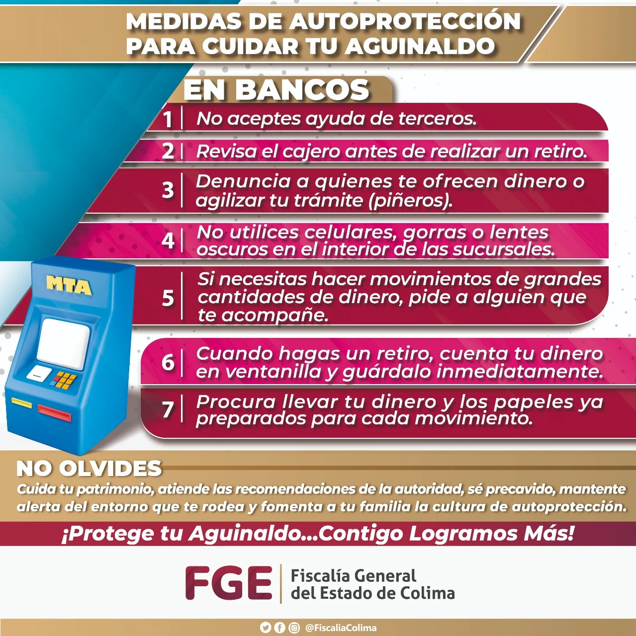 Ante la fecha límite para la entrega de aguinaldos que tuvo fecha el pasado 20 de diciembre, la Fiscalía General del Estado de Colima dio a conocer una serie de medidas para prevenir a la ciudadanía en cuanto al robo de estos.