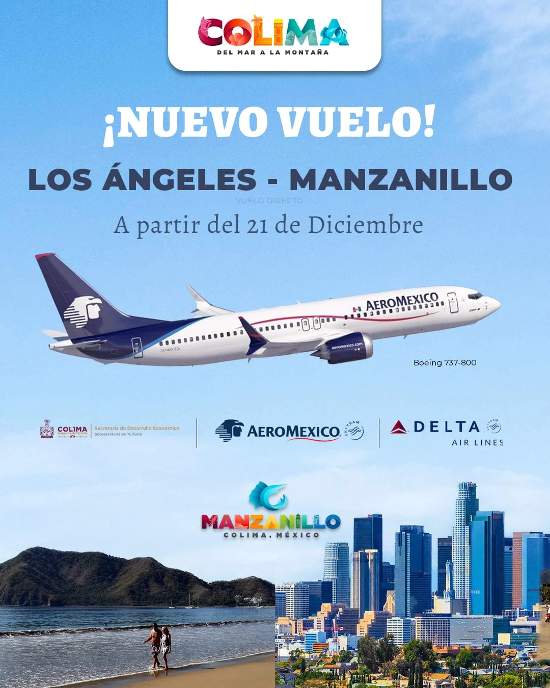 encantados de anunciar la nueva ruta Manzanillo-Los Ángeles, un logro significativo que nos permite sumar una ruta más a la conectividad internacional para el estado de Colima. Estamos convencidos de que será un gran éxito. Agradecemos el apoyo y colaboración de las autoridades y socios, sin los cuales este logro no hubiera sido posible”.