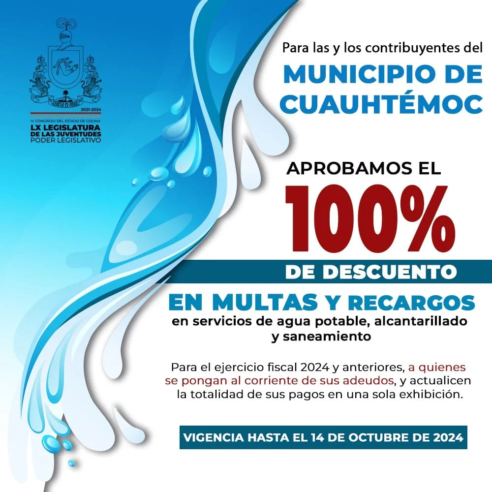 #Congreso | En la más reciente #SesiónOrdinaria, las y los diputados aprobaron estímulos fiscales para contribuyentes del municipio de #Cuauhtémoc, consistentes en otorgar el 100% de descuento en multas y recargos en servicios de agua potable, alcantarillado y saneamiento, del ejercicio fiscal 2024 y anteriores, a quienes se pongan al corriente de sus adeudos, y actualicen la totalidad de sus pagos en una sola exhibición, los cuales permanecerán vigentes hasta el día 14 de octubre de 2024.