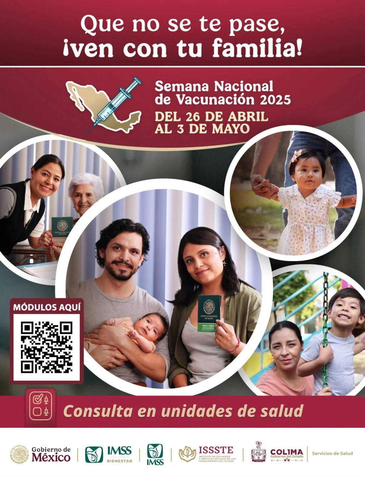 Además, se llevará a cabo la aplicación permanente de vacunas en todas las unidades de salud de las instituciones participantes. En este enlace puedes consultar módulos temporales, fechas y horarios: https://bit.ly/Vacunacion-26abr03may.