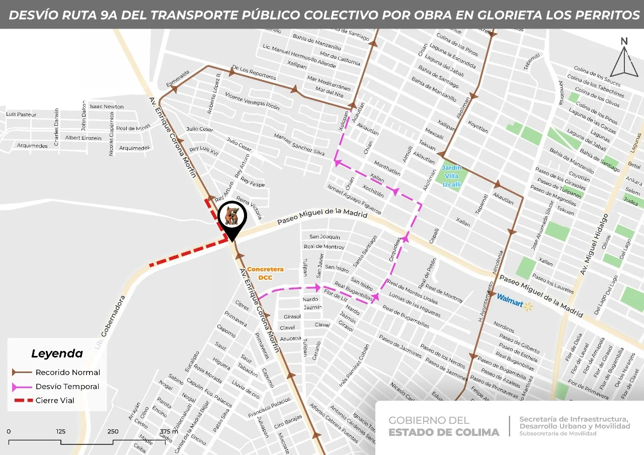 La Subsecretaría de Movilidad informa sobre la modificación temporal de tres rutas del transporte público colectivo (9-A, 14 y 27-A), derivado de las obras que se realizan en la ‘Glorieta de Los Perritos’, punto de intersección de la avenida Enrique Corona Morfín, el Tercer Anillo Periférico y el Libramiento Gobernadora Griselda Álvarez.