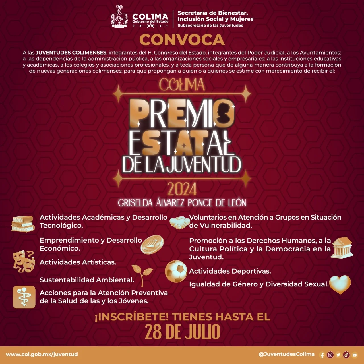 La Subsecretaría de las Juventudes del Gobierno del Estado de Colima presentó la convocatoria al Premio Estatal de la Juventud 2024 ‘Griselda Álvarez Ponce de León’, que estará abierta del 3 al 28 de julio para postular jóvenes colimenses que destaquen en diversas áreas, informó José Gerardo Romero Quezada, titular de la Subsejuv, quien detalló que este premio reconoce a jóvenes en dos categorías: de 12 a 17 años, y de 18 a 29 años de edad.